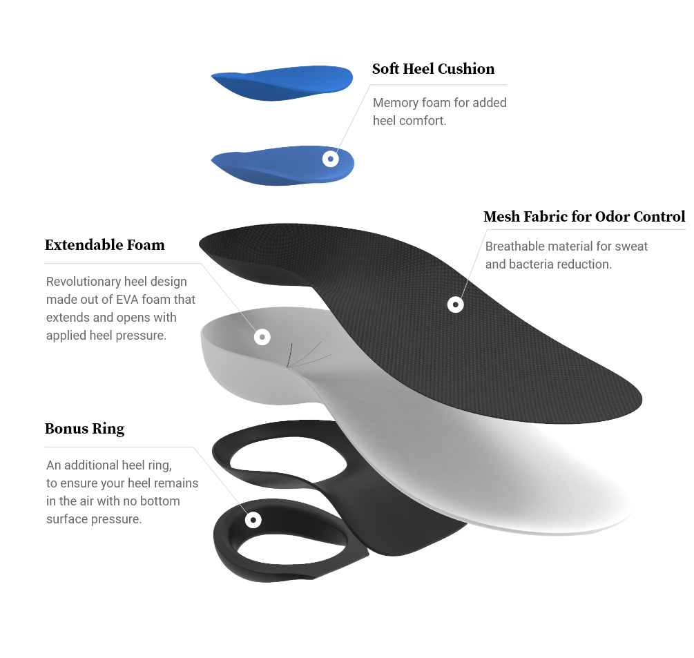 Our patented-design eliminates heel pressure because your heel and ligaments remain unprovoked in the air while within your shoes. This speeds up your healing process and allows you to continue your daily activities.